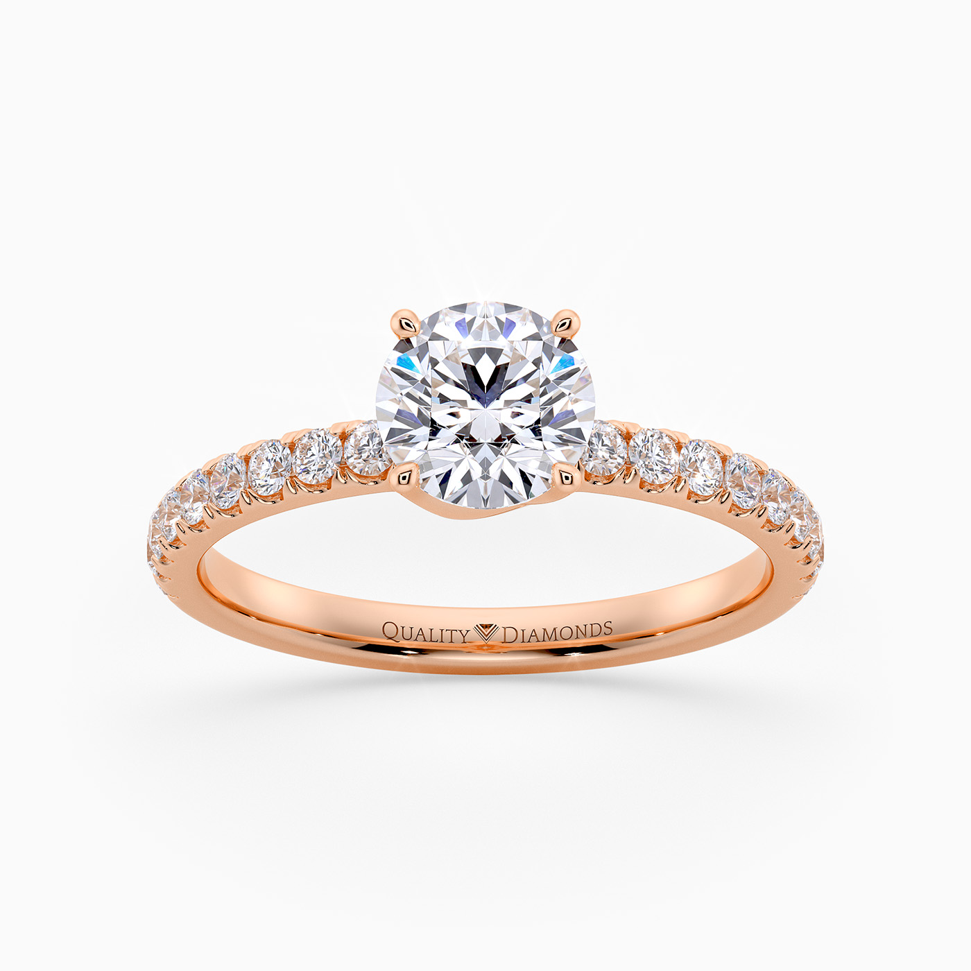 Our 18K Rose Gold diamond-set solitaire Abbraccio holds the Round Brilliant diamond proudly in a flowing four-claw twist setting. The delicate prongs are positioned to maximise light passing through the diamond, producing the most exquisite sparkle. Round brilliant diamonds are pavé-set into the shoulders, creating extra sparkly detail.
